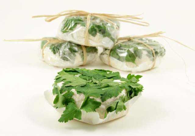 "I CACIORTAGGI" la nostra linea di formaggi avvolti da ortaggi, anche se il prezzemolo è una pianta aromatica e non un ortaggio, ma rientra comunque in questa linea di formaggi particolari. Il formaggio impiegato per questa preparazione è un tre latti (mucca pecora e capra). Il prezzemolo dopo alcuni giorni si ossiderà ma rilascerà al formaggio tutti i suoi aromi.